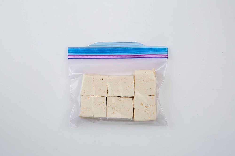 豆腐を食べやすい大きさに切ってペーパーで水けを取り、冷凍用保存袋に並べて冷凍します。絹の豆腐は崩れやすいので、手でひと口大にちぎって冷凍しても大丈夫です。保存期間は1か月。