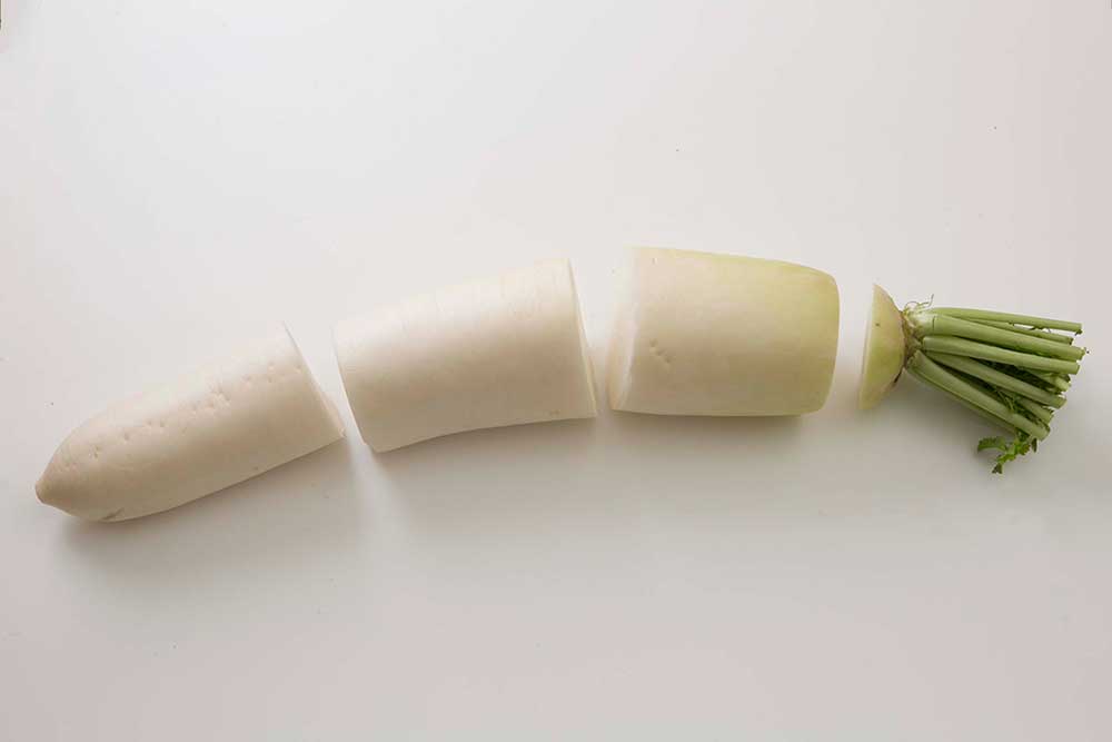 例えば、葉元はかためで甘味が強いのでサラダにおすすめ。中間はやわらかめで甘味と辛みのバランスがよいので煮物に、先端は水分が少なく辛みが強いので大根おろしなどの薬味にむいています。
