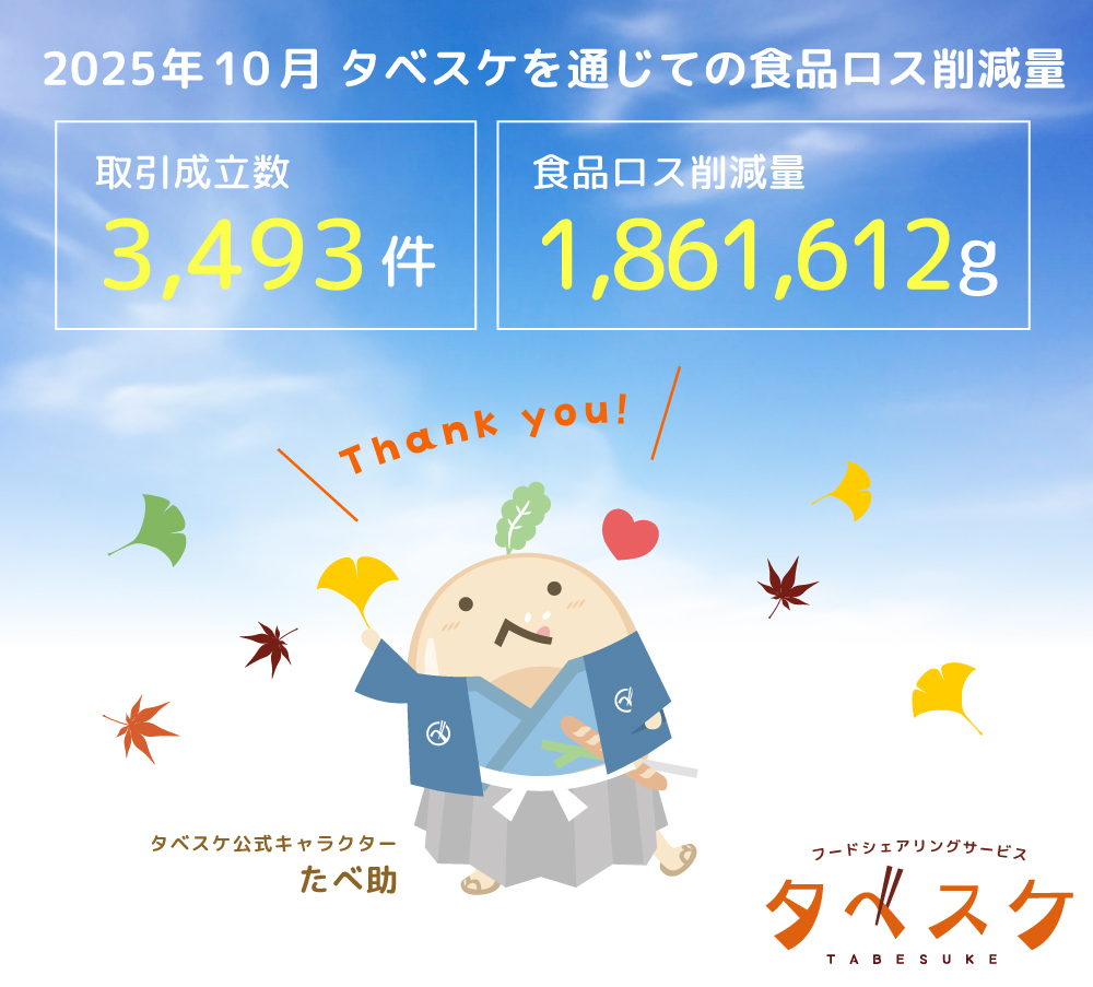 2025年10月はタベスケ を通じて取引成立数3,493件、1,861,612g(約1.86t)の食品ロス削減を達成できました!