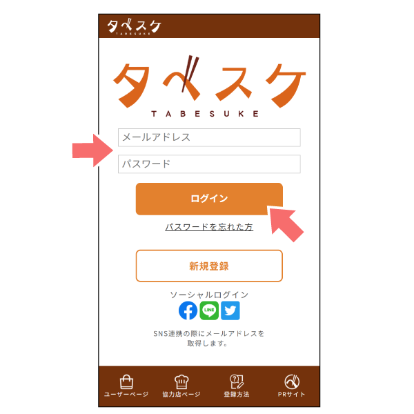 1 ユーザー画面TOPのログインフォームに登録したID(メールアドレス)と設定したパスワードを入力し、ログインボタンをタップします。※はじめてご利用の方(IDとパスワードをお持ちでない方)は新規登録をしてください。