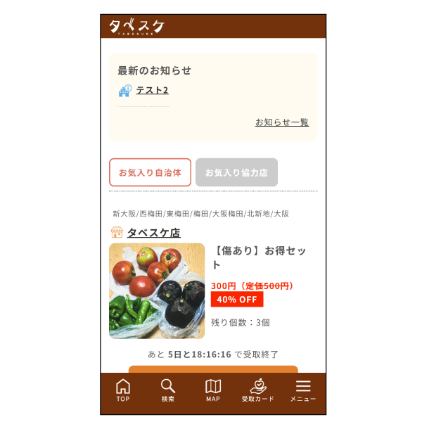 2 ログインボタンをタップするとタベスケのメインページ(出品検索や受け取りカード確認ができるページ)へ切り替わります。