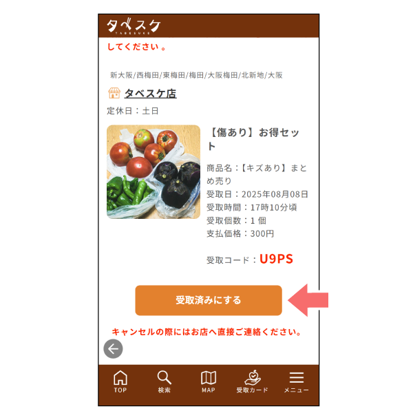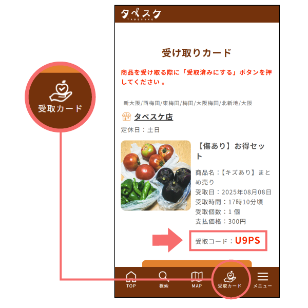 2 商品の受け取り時に受け取りカードをお店の人にお見せいただくか、受け取りコードをお伝えください。この時、受け取りカード内の[受け取り済みにする]ボタンを押して処理を完了してください。 ※店頭での確認時には、「ニックネーム」「受取カード」「受取コード」のいずれかで確認されます。