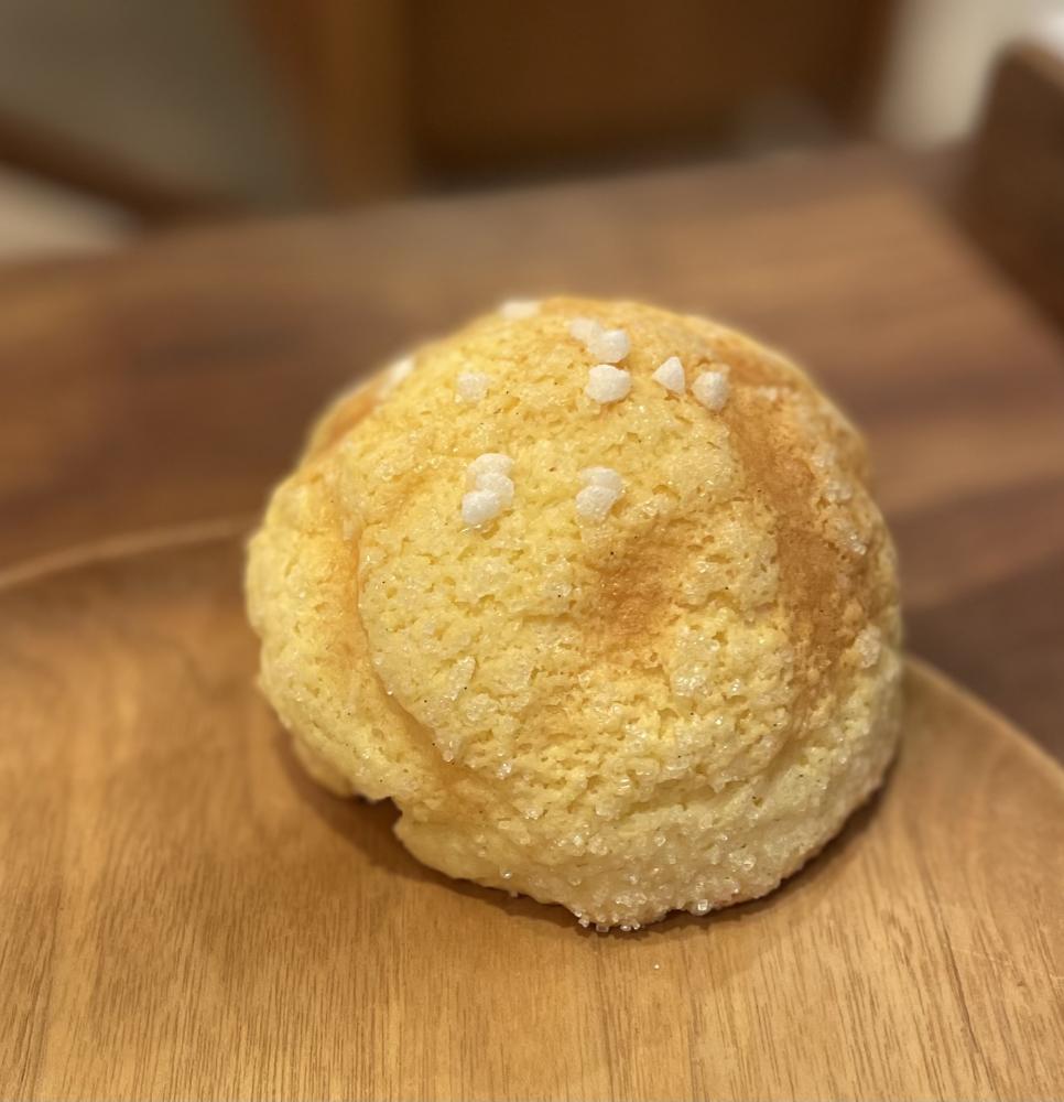 当店のメロンパン、あられ糖をトッピングしているのが特徴です。 |